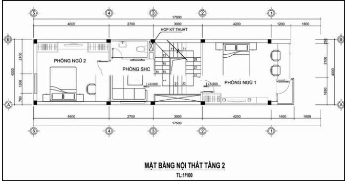 Mặt bằng thiết kế tầng 2 của ngôi nhà phố 3 tầng lệch